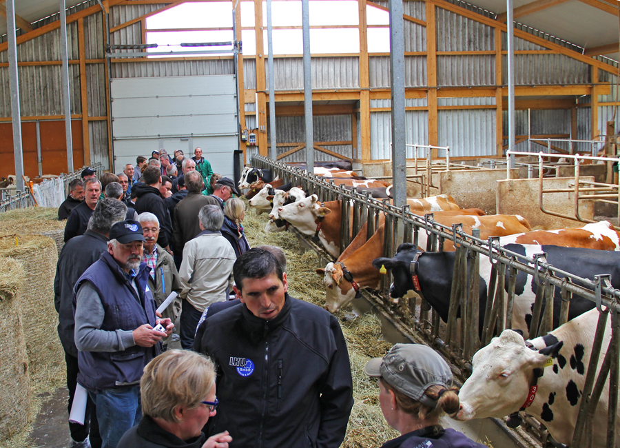 Betriebsbesuch bei Sirch Thomas in Altenmünster. AMS Betrieb, 72 Kühe, 8.600 kg Milch. Die Dame mit der blauen Tasche