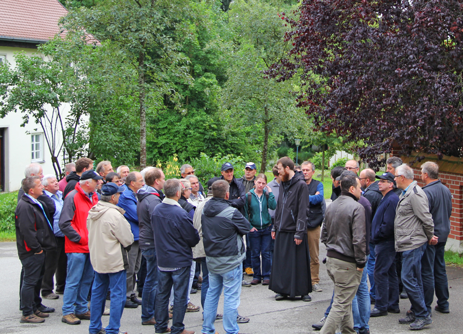 Rundgang auf dem Klostergelände mit Bruder Marinus. Zum Kloster gehört ein Stall mit 160 Kühen und 26er-Melkkarussell.