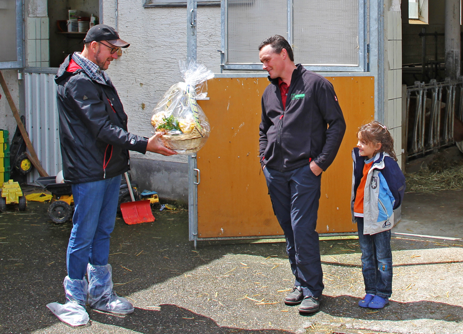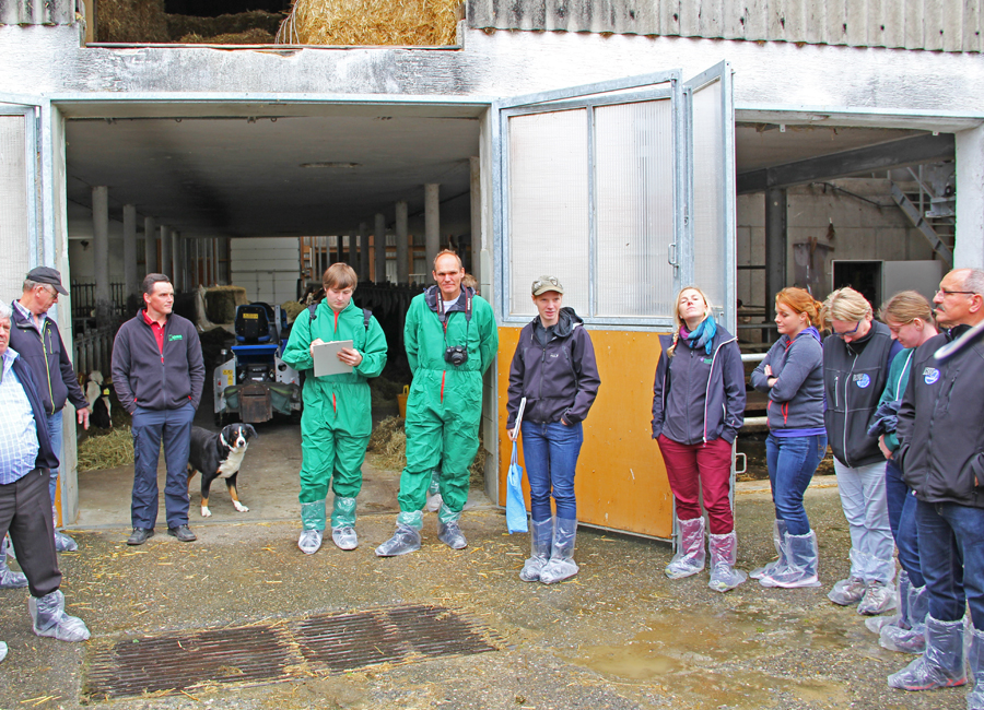 Betriebsbesuch bei Sirch Thomas in Altenmünster. AMS Betrieb, 72 Kühe, 8.600 kg Milch. Die Dame mit der blauen Tasche